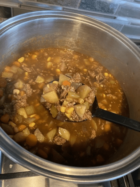 Below is a take on my usual sausage and potato soup. Normally I cut the sausages (that I typically have cooked the day before), into little rounds but I didn’t want to take the time so I just cut the sausage into little bits/shreds and put into the soup right after cooking them. I also normally use sweet potatoes, but I decided last minute when was at the grocery store to get a small bag of the little potatoes since I knew I’d be creating various dishes and that seemed like a better value at the time. I also added some frozen corn (which side note, be careful with the bag! I opened it over the pot and so much corn came flying out! The pot smelled like popcorn to me for a bit after!) I added in onion and garlic, baby carrots and celery. Oh! I also added one of those gravy type packets into it to give it some flavour and make it a little thicker so it became more like a “stoup” (word I learned from Rachel Ray years ago). Very delicious and also an easy recipe to play around with… and easy to make in a slow cooker, too. ;0)