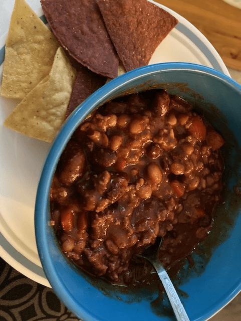 If only I could remember exactly what I did! Brian (my boyfriend), really enjoyed this dish! We had it on Halloween too.. so two nights in a row! Just hamburger meat that I cooked separately with taco seasoning, and in a slow cooker put two different kinds of beans and some tomato paste and red peppers. Once the meat was done I added it in with rest of the dish and let it sit and simmer for maybe a couple hours or so… can’t quite remember but I may have added a chilli seasoning pack in with the beans as well. So yeah we ate it with chips and I put some Frank’s hot sauce on mine. It was so nice and thick and had that slow cooked taste. Very delicious and will absolutely be making it again!